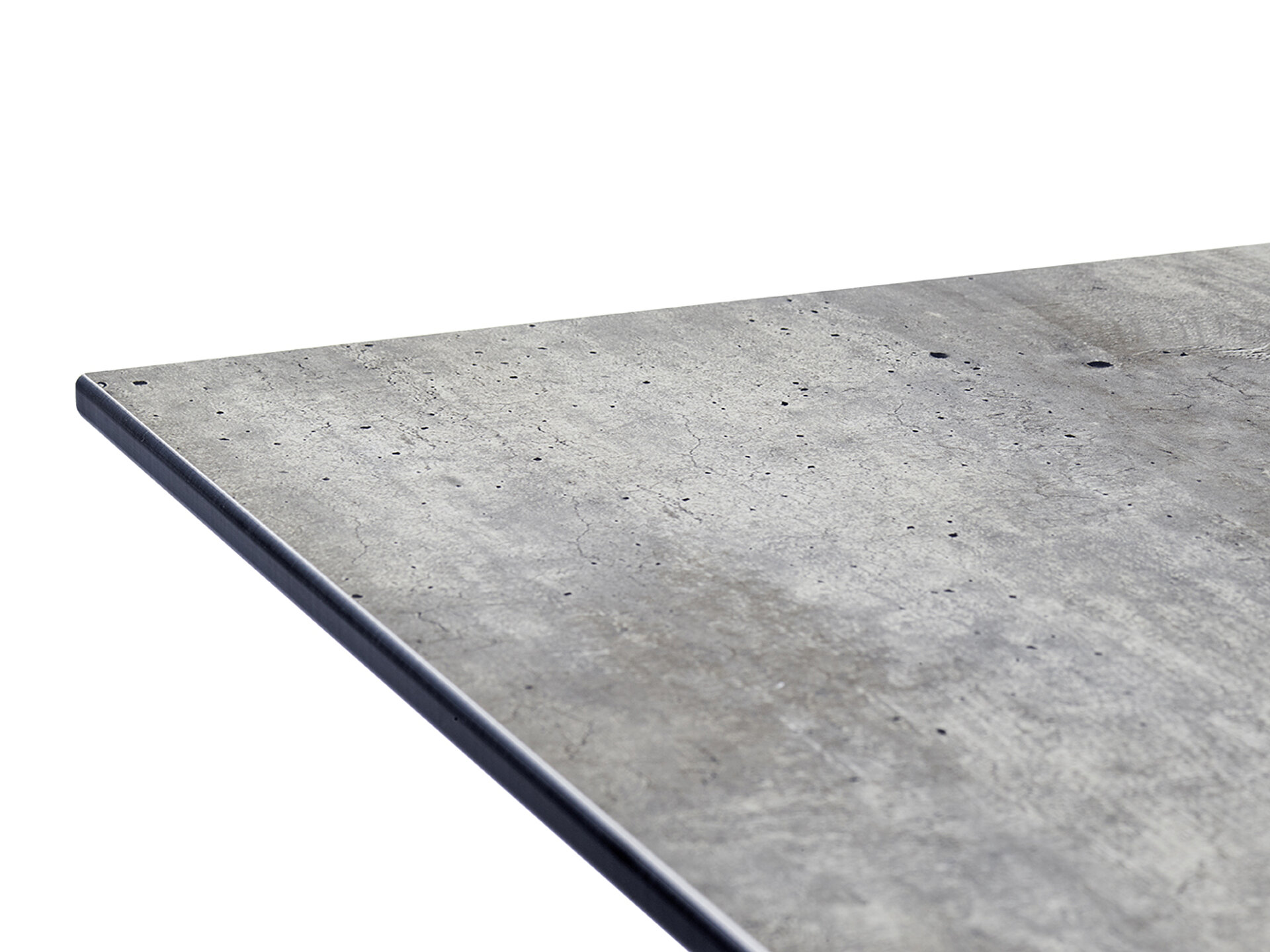 Die 10 mm starken hochwertigen Polytec®-Tischplatten in den Dekoren Schiefer anthrazit und Beton hell sind duromere Hochdrucklaminate (HPL) mit einem äußerst wirksamen Witterungsschutz und daher bestens für den Outdoor-Bereich geeignet. Ihr modernes Styling erhält die Platte durch die abgeschrägte und farblich angepasste Kantengeometrie.
